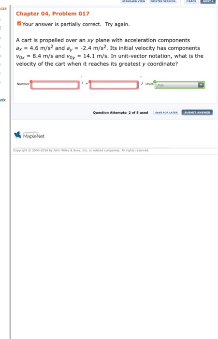 Its initial velocity has components v_0 x80 ms and v_0 y12 ms. 22335 results page 41. PRINTER VERSION BACK NEXT CES Chapter 04 Problem 017 A cart is propelled over an xy plane with acceleration components ax 65 ms2 and ay -28 ms2.