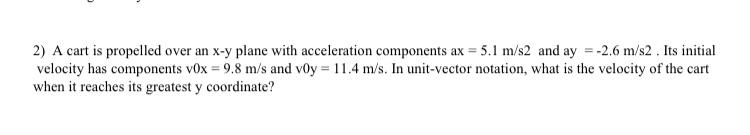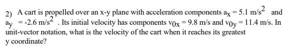 See the answer See the answer done loading. A cart is propelled over an xy plane with acceleration components ax 46 ms2 and ay -19 ms2. In unit-vector notation what is the velocity of the cart when it reaches its greatest y coordinate.